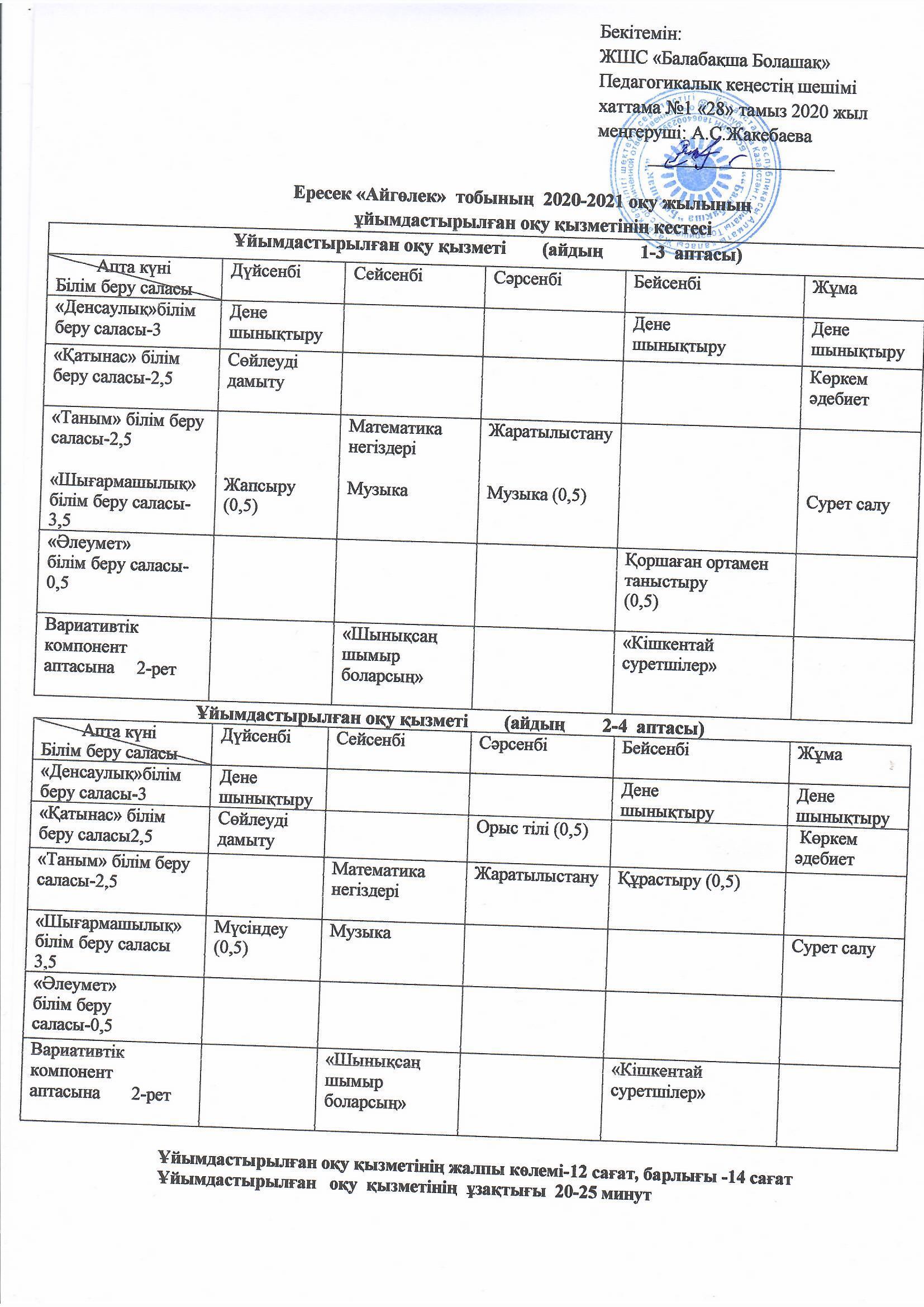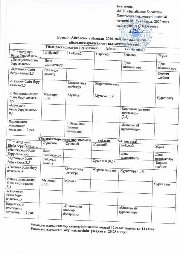 » » "Айгөлек " Ересек тобынының оқу қызметінің кестесі 2020-2021 жыл.